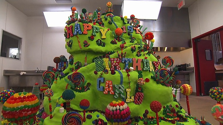 Season five, episode four of "Cake Boss" sees Buddy Valastro and his team constructing a massive art piece to celebrate the first birthday of Valastro's son, Carlo. The lime-green cake looks like it could have come straight from Willy Wonka's chocolate factory. Its bright "Candyland" theme was executed flawlessly, in our opinion, with gumball machines flanking either side of a towering candy mountain decorated with a plethora of lollipops and other confections. The structure of the piece is made of white cake and Rice Krispies treats. Though the cake looks grand enough, the centerpiece is barely visible in the photo: an actual flowing chocolate river that's being pumped in via chocolate fountains behind the cake.