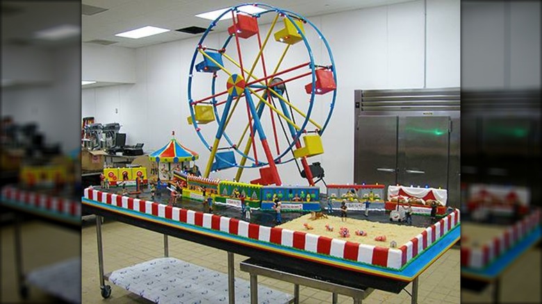 Everyone loves the fun that comes with fair food dusted in powdered sugar, but Buddy Valastro turned the concept on its head when he made this fair-themed cake. He knew he had to pull out all the stops when New Jersey's State Fair Meadowlands ordered a cake to celebrate its 25th anniversary. True to form, the team didn't cut any corners when it came to this cake, which we're sure stunned even the most seasoned "Cake Boss" viewer. Playfully decorated with primary colors, the cake laid out an entire carnival scene, patrons and fair games included. The most impressive parts of the cake were its Ferris wheel and merry-go-round, both of which actually spun.