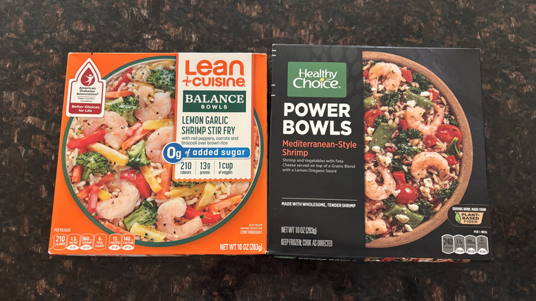 Shrimp is not typically a protein I seek out in frozen meals, though I gave it a go in both Healthy Choice's Mediterranean-style shrimp bowl and Lean Cuisine's lemon garlic shrimp stir-fry. It's important to note that these aren't identical meals, but they both feature shrimp with grains and veggies, so the similarities were apparent.