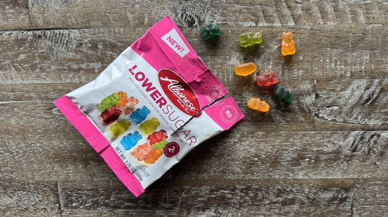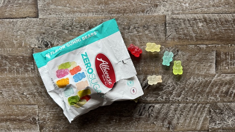 The first big point of contention I had here was that these candies tasted like ... nothing. Like the other selections, even the low-sugar ones, had a little bit of fruity flavor and some sweetness, but this one was very restrained — too restrained, as its placing on this list indicates. They kind of felt like eating erasers. There's a plasticky undertone present, but the orange, lemon, raspberry, and strawberry candies all blend into one pile of disappointing mush. I didn't think that I would ever be asking a gummy bear brand to be a little bit sweeter — but here I am. Maybe it's because Lily's uses allulose in its candies and didn't want to fall into the same trap as Atkins and make something that was overwhelmingly artificial.