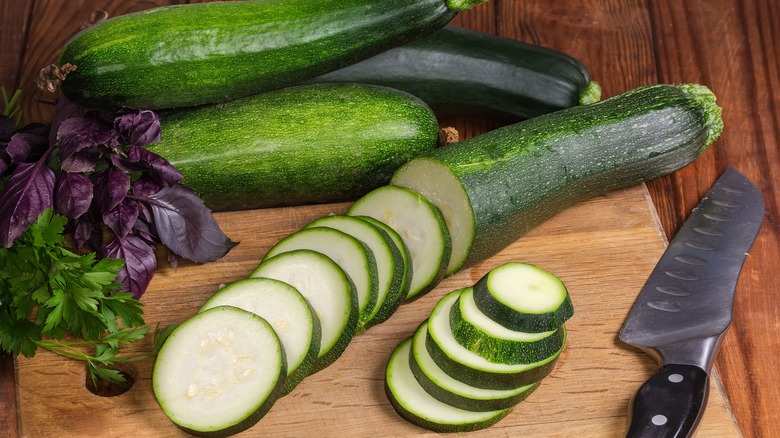 In fact, not all zucchini are long and cylindrical; some are stubby and short, whereas others are plump and round — almost like a mini grapefruit — and have a milder flavor. In some farmer's markets, you can find zucchini that still have their vibrant, edible yellow flowers attached as well as unusual patterns on their skin. However, you're likely more familiar with standard zucchini that look like dark green cukes. Zucchinis benefit from being sauteed or baked, like other popular types of squash. Boiling them turns them mushy and sloppy, so it's best to roast or fry them to maintain their buttery flavor and structural integrity — and avoid these common zucchini mistakes.
