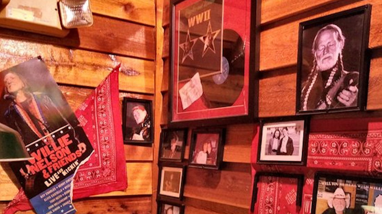 Despite the large size of most Texas Roadhouse restaurants, you can't miss Willie's Corner. The designated area is set up as a corner booth, and some locations even have a guitar-shaped neon sign hung above, marking its presence. The chosen decor for Willie's Corner is unique to every location. Some are more simplistic, with red bandanas, framed pictures of Nelson from different eras of his career, and announcement posters from past events where he was present. Other locations, however, celebrate the artist with murals and platinum records on the wall. It is a truly immersive experience for any country music fan, and it goes far beyond just the corner booth — the servers themselves often wear those iconic "Willie Braids," and, if you're lucky, they may even wish you a "Willie nice day."