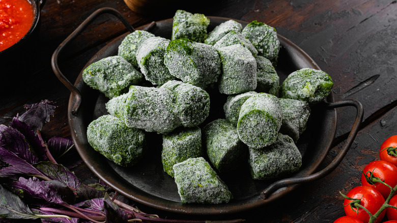 Frozen spinach has already been cooked during the packaging process. Like many other frozen vegetables, it's ready to eat after just a quick warming up. Because you'll often find spinach frozen in dense bricks, it's tempting to pop more than a couple in your pan to save time, but in doing so, you're preventing the heat from getting all the way through the mass. It's better to allow space to both break up the spinach as it heats up and let that excess water steam off. Julia Child recommends just defrosting the bricks enough to be able to chop them into smaller pieces to aid a quick heat-up. She either heats the slightly defrosted and separated chunks in a pan without anything else in it, or with melted butter.