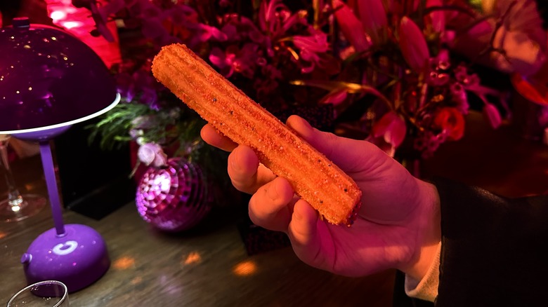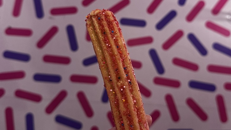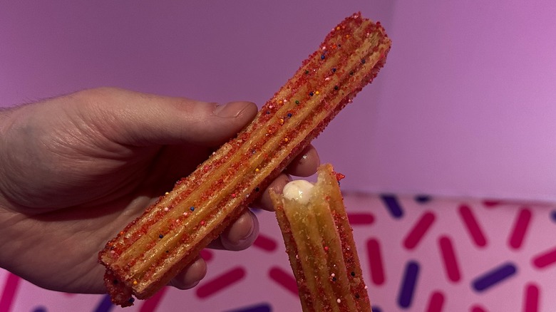 Perhaps most surprising was just how well the birthday cake icing complemented the churro's flavor rather than clashing with or overpowering it. Churro dipping usually involves chocolate — if you've ever eaten one in Spain, you know. Birthday cake flavor is much closer to vanilla and doesn't feel like it would be a natural pairing at first glance, but it's subtle here and plays well off the churro's cinnamon (ahem, pink) sugar sweetness and lets it shine. If the icing weren't present, this would still be a good churro, but it's boosted by the birthday cake. You definitely have to keep an eye out for icing dripping out of the back end, and be careful if you decide to break it in half — the icing in the middle is piping hot. But as long as you aren't keen on cross sections for a mini photo shoot, you should be fine.