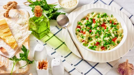 Risi e bisi, literally meaning "rice and peas," is typically prepared in the spring, when fresh green peas are in season and are readily available in home gardens and markets. Today, however, people can use frozen peas and make this dish year-round. After these two core ingredients, a good dose of Parmesan and a rich flavorful stock are key. Traditionally, chicken stock is preferred but risi e bisi can easily be made vegetarian using vegetable or mushroom stock or broth. And if not making a vegetarian version, tiny cubes of pancetta or Prosciutto are usually added as well, but can be omitted if desired. Finish it up with freshly ground black pepper and chopped Italian parsley for a classic Venetian supper.