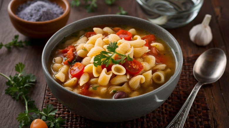 Pasta e fagioli is a simple but hearty soup made from pasta and protein-rich beans. It's as filling and comforting as it is easy to make. That's not to say there aren't many different versions of pasta e fagioli, which vary by region, province, and even household.