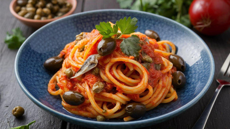 Although the lore and name of this savory dish suggests an association with Neapolitan ladies of the night, historians of Italian foodways disagree on the origins of pasta puttanesca. Jeremy Parzen, an expert on all things Italian, writes in his blog Do Bianchi that this popular preparation likely comes from the region around the isle of Ischia and the Amalfitan coast. Tomatoes, capers, olives, anchovies, and garlic are widely used in recipes in that area. Parzen argues that "the qualifier alla puttanesca refers to the fact that it is not a rich dish" but instead contains a pasta sauce made from "humble" foodstuffs. Regardless of the origin or the name, pasta alla puttanesca is a wonderfully savory recipe that comes together quickly using just a handful of pantry ingredients.