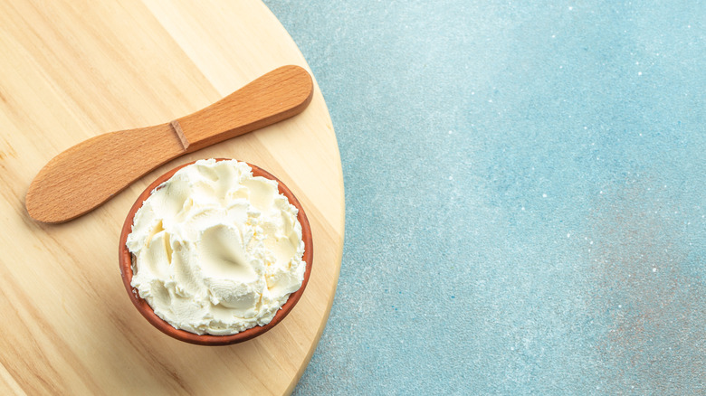 Rather than reaching for a standard block of cream cheese for this hack, you'll want to use a whipped product. If you can't find the right-sized container of whipped cream cheese, though, you can always beat your cream cheese in a stand mixer until it's creamy and easy to spread. For a sweeter profile that mimics the mouthfeel of cheesecake, consider whipping a block of cream cheese with some sugar and vanilla extract.
