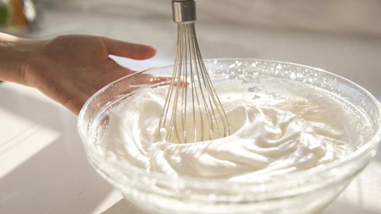 Whipped cream or topping isn't the only garnish your banana pudding deserves. If you want something more flavorful and towering on top of your dessert, try your hand at a meringue. It's important to note here that you'll need to make a cooked meringue, like an Italian meringue, since you won't be baking it in the oven before you eat it. French meringue, which is made by adding sugar to egg whites, will not suffice here because they're not cooked. Italian meringue is highly stable, which means it will keep its shape easily atop your pudding.