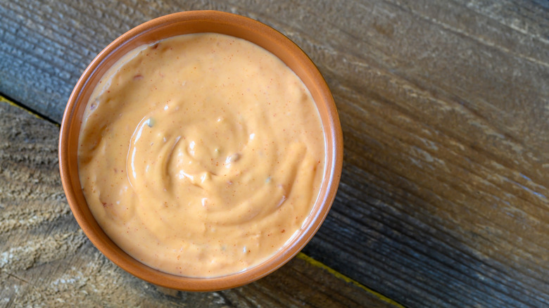 Horseradish is a great way to add a kick of heat to dips because the root vegetable delivers the same spicy intensity as traditional spice enhancers like chili pepper or cayenne seasoning, but the spiciness doesn't build on the tongue. Instead, it dissipates, allowing other flavors to shine through the heat. This sauce is easy to make, but even easier to overdo. We recommend starting out with a cup of mayo, and then adding a tablespoon of horseradish at a time (we wouldn't add more than four tablespoons), until you feel like there's a good balance between tangy and spicy. To balance out the strong flavors, we recommend mixing in a tablespoon of ketchup for some sweetness. You can do a tablespoon of sugar instead, but we find ketchup gives you a nice acidic kick from the tomato and jives with the other ingredients better.