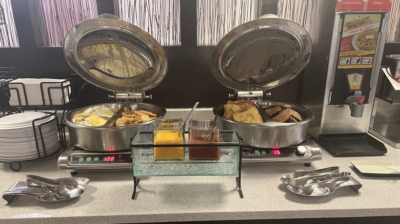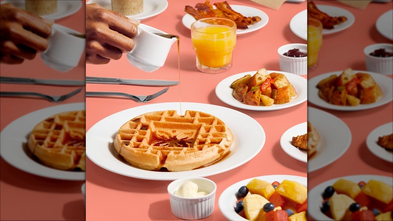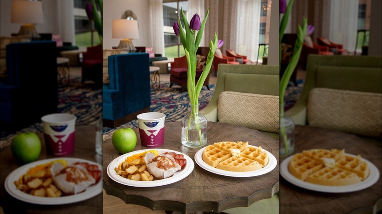 One particular breakfast perk at the Hampton Inn is the presence of a waffle machine. While we can't speak to the quality or ingredients in the batter, there is something comforting and fulfilling about being able to make yourself a thick, fluffy waffle in the morning and cover it with all the fresh fruit you want. If you're still not convinced, consider the fact that Paris Hilton herself, famous for being a Hilton heiress, among other things, promoted the waffles by designing a line of strawberry pink waffles which became available at some locations in October 2024. Fans could even purchase the waffle mix to bring home. In addition to the waffles, many reviewers say the Hampton Inn often has a good selection of foods, including cereals, eggs, bagels, muffins, and fresh fruit.
