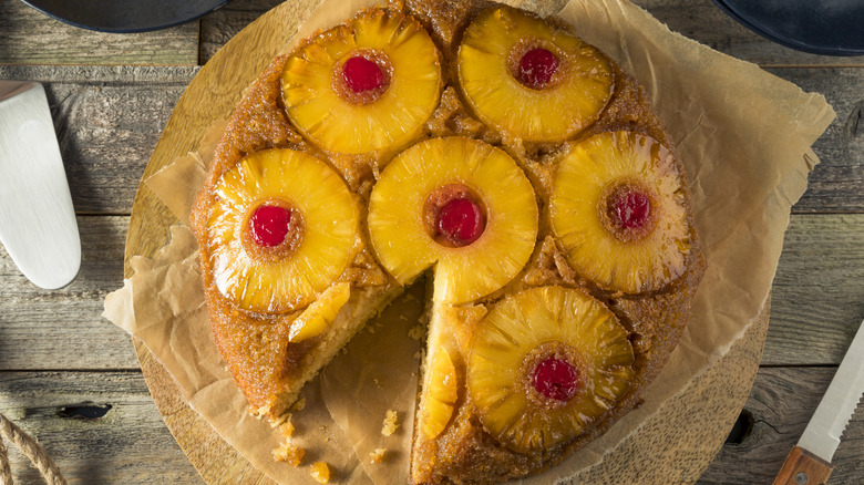 If you've experienced the sweet, tropical deliciousness of a pineapple upside-down cake, you'll have marveled at the perfectly cut rings of pineapple that sit atop the buttery sponge. These, of course, come from a can. Thanks to convenient canned pineapple rings, this retro bake is incredibly easy to make, with no peeling, slicing, or coring required.