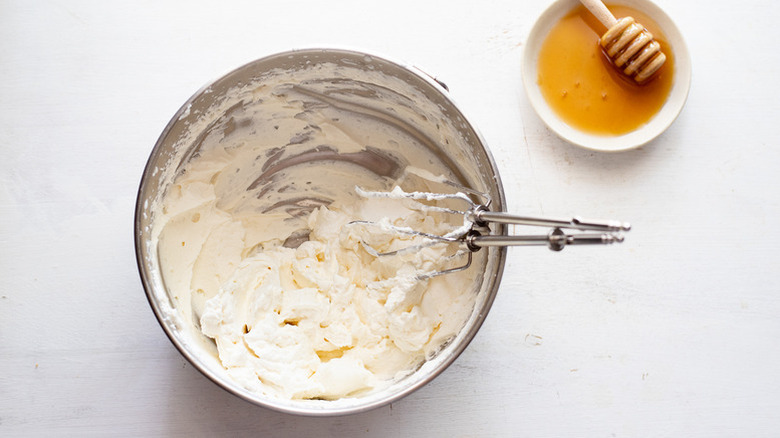 Peaches and cream — it's a timeless combination. After all, the sunny sweetness and soft texture of peaches make them perfect for pairing with a light, fluffy topping. And that's where honey whipped cream comes in. If you usually sweeten your cream with sugar, we urge you to make the switch to honey. It adds a distinct, delicate taste that enhances the richness of the cream to no end, and this simple homemade creation couldn't fit more seamlessly into a bowl of peach slices.