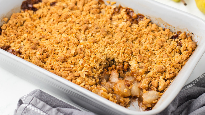 Crumble has to be one of the most versatile desserts going, with an array of different fruits tasting magnificent alongside that crunchy, buttery topping. Apples, rhubarb, and plums are popular choices, but pears are another fantastic option. They're sweet and tender, yet hold their shape well, and also pair well with other fruits and spices. And yes, you can certainly use the canned variety here.