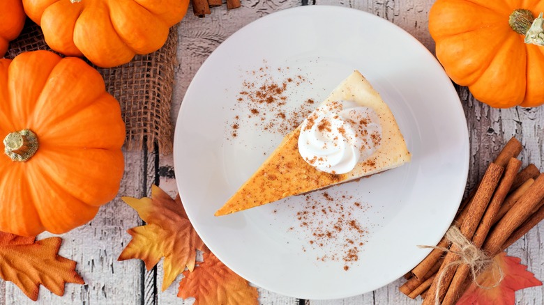 First, make a simple crust. Crush up some graham crackers or gingersnap cookies, mix them with melted butter and sugar, press the mixture firmly into the base of a springform pan, and then pop it in the fridge to chill. Next, prepare the filling by beating cream cheese with ingredients like powdered sugar, vanilla, canned pumpkin, and pumpkin pie spice. Then, pour in heavy cream and continue whipping until the mixture is thick enough to hold its shape. Spoon the creamy topping over the chilled crust, smoothing it out evenly, and chill your dessert for at least four hours or preferably overnight. To serve, gently run a knife around the edge of the pan, unclip the sides, and use a cake lifter or two spatulas to transfer the cheesecake to a plate. Top your pumpkin-infused creation with swirls of whipped cream to decorate, if desired.