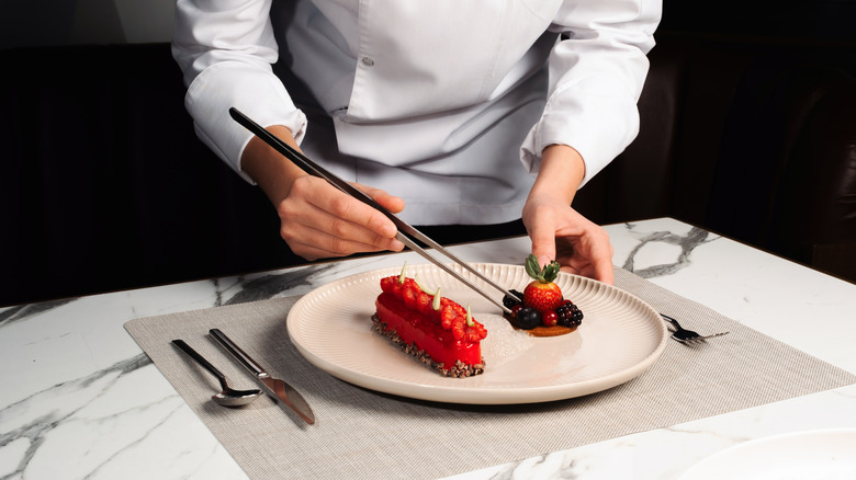 "Cleanliness and uniformity are key," says Saura Kline — it's the one thing she takes extra care to emphasize when it comes to plating desserts. If you're cutting up a cake or pie and start plating up messy slices, your dessert will look sloppy and unthoughtful. Though it can be hard to achieve the perfect cut of pie or an even cut of cake, taking extra care to get a beautifully clean cut on all your desserts is key to plating like a Michelin-starred chef.