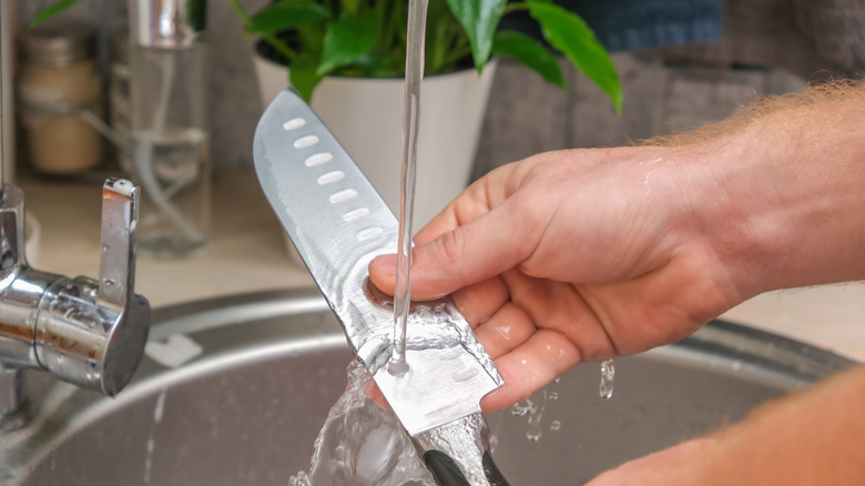 Kline uses a large container of hot water to heat her knife when cutting and plating lots of desserts at once, but if you have fewer cuts to make, you can just run your knife under hot water at the sink. However, you should make sure your knife is dry before you go back to cutting your dessert to avoid accidentally getting water on your plate or your dessert.