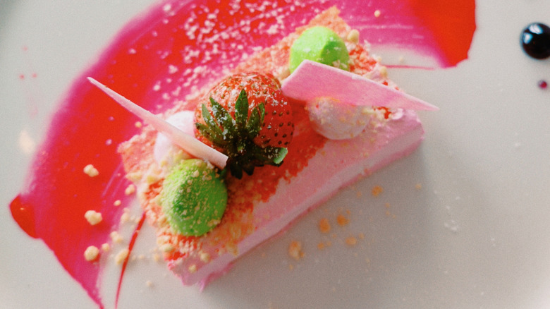 When you think about plating your dessert with fruits, sauces, and leaves, don't choose your pairings based on color alone. You need to be considering the flavors of each pairing to make sure that none of your additions will create a bad bite for your guests — even if it's just a single berry on the side. Some of the most commonly used berries for plating desserts include strawberries, raspberries, and blackberries. Less common picks like gooseberries (as long as you're not in the U.S., that is) or seasonal fruits can also get the job done when it comes to a beautiful dessert plate. If your dessert already includes some kind of fruit in it, you can also use the leftover fruit for plating, matching the flavors present in your dessert.