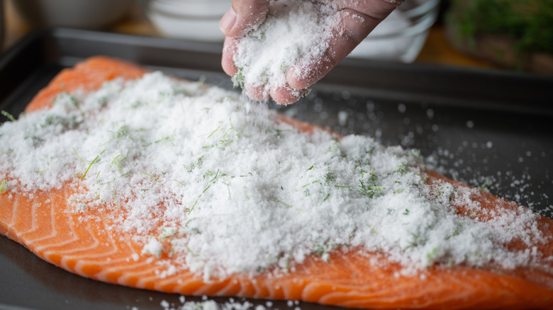 To salt cure the salmon, trim any fatty underbelly and divide the filet into loin and belly. Then you'll rub equal parts salt and sugar over every side of the two large pieces before setting them on a cooling rack over a baking sheet and putting them in the fridge. Let the sugar and salt draw out liquid for 45 minutes.