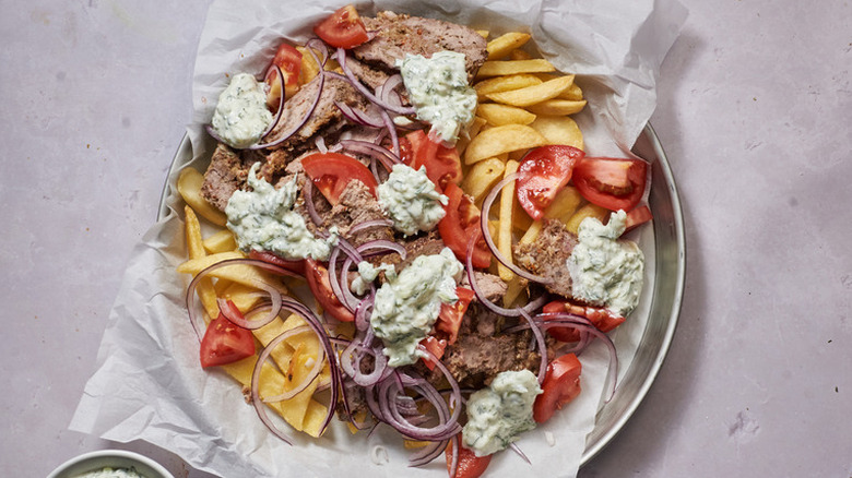 To give your fries a meaty, Mediterranean-inspired twist, try topping them with flavorful gyro meat. These slow-roasted, perfectly seasoned slices of lamb completely transform the fries with their aromatic savory depth, creating an irresistible contrast to the crispy, salty base. Opting for store-bought gyro meat is no problem, but making your own from scratch is completely doable, too. First, blitz onion, garlic, and strips of bacon in a food processor, before combining this mixture with ground lamb, breadcrumbs, oregano, cumin, Aleppo pepper flakes, salt, and pepper. Once everything is mixed thoroughly, press the meaty medley into a loaf pan, and bake in the oven. When the gyro meat is cool enough to handle, drain away any excess grease and slice it thinly.