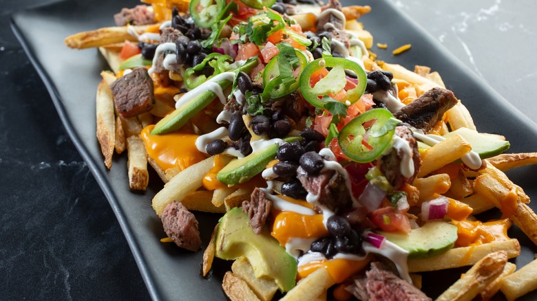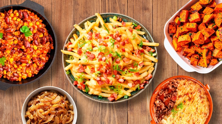 With a bed of fries as a crunchy, savory base, the choice of toppings is very much open to interpretation, and easy to adapt depending on your taste or dietary requirements. Whilst it's a perfectly adequate option, there's no need to stick to the classic cheese-and-bacon option, when you can make things a whole lot more exciting. Pile your fries high with a medley of meats, cheeses, or veggies, smother them in your favorite sauces, or create a crowd-pleasing hybrid dish — shepherd's pie loaded fries, anyone? Or, if you want to experiment with global flavors, go for Mexican-style toppings. And don't assume that loaded fries can't serve as an indulgent dessert!