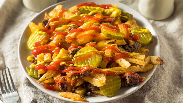 First, pop the fries into the oven or air fryer. Meanwhile, saute onion and garlic in a pan, then add the ground beef and cook until browned. When the fries are done, spoon the beef on top, along with some shredded cheddar or American cheese, and place them back in the oven to finish off. This is a great time to prep your burger sauce. A combination of mayonnaise, yellow mustard, sweet pickle relish, onion, paprika, garlic powder, and salt creates a wonderfully creamy and tangy sauce that's reminiscent of what you'd find in a classic Big Mac. Spoon this all over the hot cheeseburger fries, adding some pickles and shredded lettuce, too, and you've got yourself the ultimate hearty mashup.