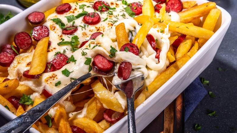Loaded fries might not be considered the most sophisticated of meal choices, but there's nothing to stop you amping up the gourmet vibes here. Caramelized onions and chorizo make for a truly moreish fry topping, which brings a touch of elegance to the dish, too. The balance of smokiness, spiciness, and sweetness this duo creates is hard to resist, and it's the perfect way to level up from your typical cheese and bacon recipe, while keeping things just as indulgent.