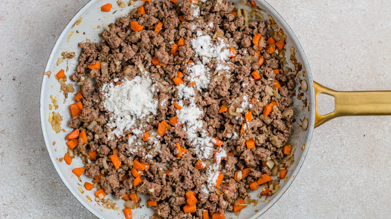 To prep the shepherd's pie filling, saute diced onion, carrot, and garlic in a skillet, then add ground beef, breaking the meat down as it cooks. Sprinkle in some flour and stir well, before adding beef broth, Worcestershire sauce, and tomato paste. Let everything simmer for about 10 minutes. Next, toss in some frozen veggies, like peas, carrots, or corn, and allow these to cook through. If you need to thicken the mixture further, make a slurry by combining cornstarch and water, and stir this into the meat filling over a medium heat until you reach your desired consistency.