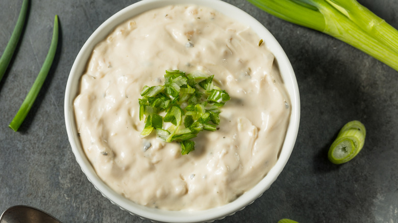 While you're welcome to just add dry buttermilk ranch dip mix like Hidden Valley Ranch Seasoning Dip & Salad Dressing Mix to your onion ring batter, there's another method that works, too, and provides multiple layers of ranchy goodness. Dip your onion rings first in a mixture of flour and cornstarch, mixed with ranch mix. Then, dip them in a mixture of buttermilk and ranch mix. And, finally, dredge them in a mixture of panko crumbs and ranch mix. To intensify the ranch-ness, you can add dried dill, dried parsley, and black pepper to the panko bread crumb mix, too. With some creamy buttermilk ranch dip, these buttermilk ranch onion rings will be a thing of legend.