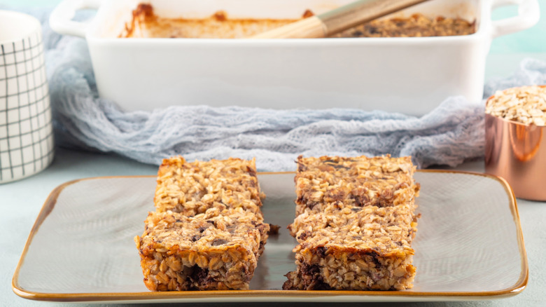 Whether you opt for peanut butter and banana oatmeal or cinnamon apple baked oatmeal, there are generally two ways to cook it: As a batch in a baking dish, or in portion-sized ramekins. If you've baked a full pan of gooey oats, you can place the whole thing in the fridge (if you have the space), but you'll need to create an airtight seal with plastic wrap. If you like your baked oats on the firmer side, a better option is to cut them into portion-sized slices and transfer them to an airtight container, with a layer of paper towel or parchment paper between each slice.