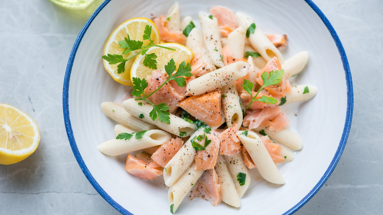 A creamy pasta dish oozes indulgence, and one way to amp up those rich flavors and textures even further is with the addition of salmon. There are several variations on this Italian-inspired creation, from salmon pasta with a tangy, tomato-based sauce to a classic alfredo, or even recipes made with a zesty lemon and garlic butter. Ultimately, you can pair salmon with just about any Italian pasta sauce that takes your fancy. And it's down to you whether you go for pan-seared or smoked fish here.