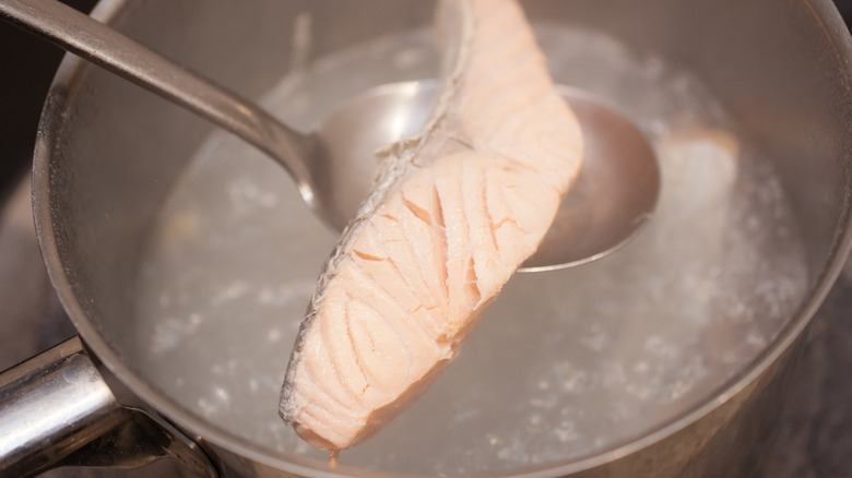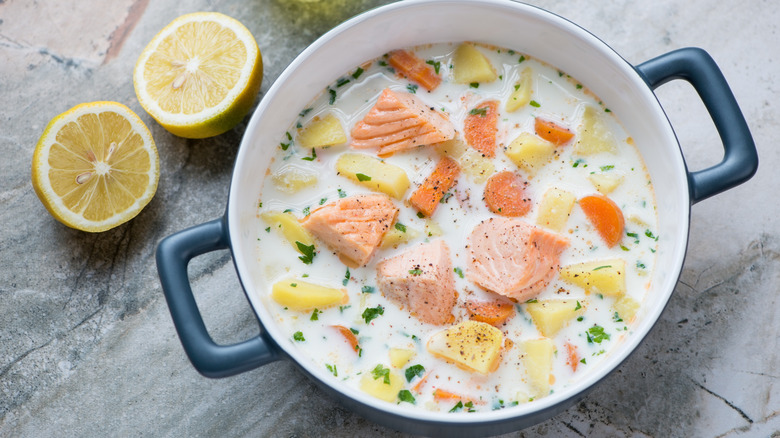 When it comes to making this dish, there isn't necessarily a set recipe to follow. With poached salmon as the base, and a brothy, chunky consistency being the goal, there's room to experiment with a variety of add-ins here. Some recipes poach the fish in broth or white wine, often spiced with mace or nutmeg. Many include veggies such as mushrooms, turnips, onions, or potatoes, and fresh herbs like parsley. Once the fish has cooked through, you can leave it as one whole portion or flake it into bite-sized pieces, combining it with the other cooked ingredients and ladling over the broth to build a satisfying bowlful.