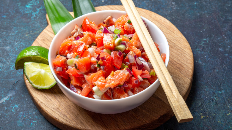 The word "lomi" means "to rub" in Hawaiian, which here refers to the method of rubbing salt over the salmon flesh. This is step one of the recipe. Once sufficiently coated in salt, wrap the whole filet in plastic wrap, pop it onto a plate, and chill it for 24 hours. After this time, it should be sufficiently cured, boasting a firmer texture and richer flavor. Unwrap the salmon, clean off the excess salt, and remove the skin. Then, chop it into small cubes, and toss the fish with diced tomatoes, green onions, sweet onions, lemon juice, sugar, and pepper.