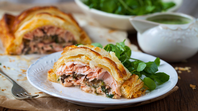 Despite its impressive appearance, salmon en croute is relatively easy to make. As well as the tender fish, this dish also typically includes a layer of creamed spinach. To prepare this, first sauté shallot and garlic in a skillet, then add the spinach and cook until wilted down. Next, stir in cream cheese, grated parmesan, and lemon juice. This savory, creamy mixture can then be spread straight onto a sheet of store-bought puff pastry (in the center) before placing the salmon fillet on top. Now, you can wrap the sides and ends upward to cover the fish and spinach mixture. Secure the seams by pinching with your fingertips, then flip the pastry parcel. After a quick score and brush with beaten egg, it's ready for baking. The pastry should puff up beautifully as it cooks, becoming flaky and golden brown. The fish inside will be wonderfully moist and tender, too.