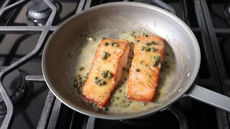 First, season salmon filets with salt and pepper, and then pan-fry until crisp and cooked to your liking. This should take about seven to eight minutes in total, with a flip partway through. Now, you can remove the salmon from the pan and set it aside whilst you prep the sauce. For this, add vegetable stock, lemon juice and zest, white wine, capers, salt, and pepper to the pan and mix well. Simmer until the liquid has reduced by about half, then add butter. Stir until smooth and thickened, then place the fish back in the pan to coat it in the sauce. Serve as is, with steamed veggies, over pasta, or with crusty garlic bread to create a more substantial meal. Some fresh garnishes such as lemon wedges, dill, and parsley are great for boosting the presentation too.