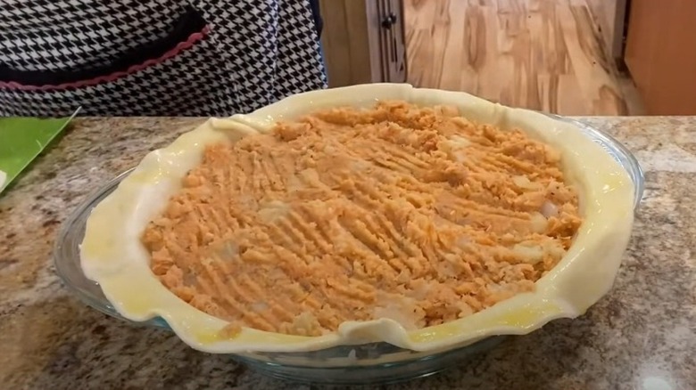 To make this salmon pie, start by rolling out a pie crust. Drape this over your pie dish and push it down to line the base and sides. For the pie filling, combine boiled potatoes, sautéed onions, thyme, salt, black pepper, melted butter, and drained canned salmon. Just mash the ingredients together until thoroughly mixed, then spread the mixture into the lined pie dish. Brush the edges of the bottom pastry layer with beaten egg, then top with another layer of rolled out pie crust. Now, you can trim away any overhanging pastry, and use your fingers or a fork to crimp the edges with, depending on your go-to crust crimping technique. Poke a few holes in the top of the pie, then bake until the pastry is a glorious golden brown.