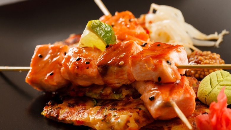 The best salmon yakitori will have just the right balance of sweet, savory, and tangy flavors in that all-important marinade. A mixture of brown sugar, soy sauce, mirin, and rice vinegar works brilliantly. Diced salmon fillets are coated in this flavorful concoction and left to marinate for at least 30 minutes. Then, it's a simple case of threading the fish onto skewers, brushing it lightly with oil, and grilling to perfection. You can also add some other veggies to the skewers, such as bok choy, bell peppers, or green onions, if desired. The fish should take around seven minutes to cook, and make sure to turn it over halfway through. Serve over rice, perhaps with a sprinkling of sesame seeds, or as part of a spread of other must-try Japanese dishes.