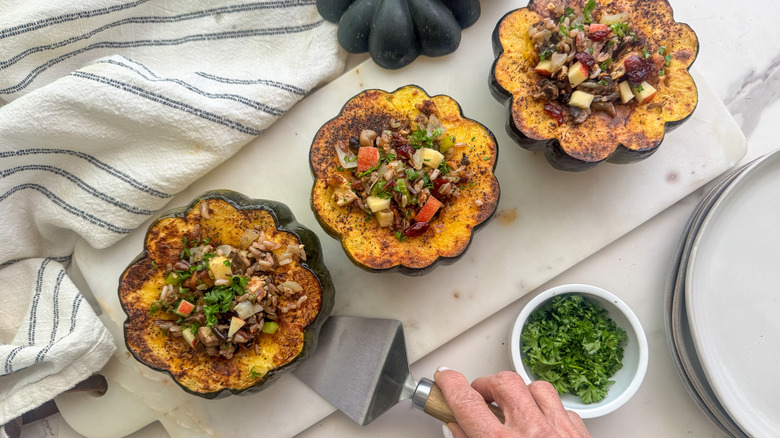- Pull the acorn squash out of the oven. Stuff each one with the filling, top with optional fresh parsley, and serve.