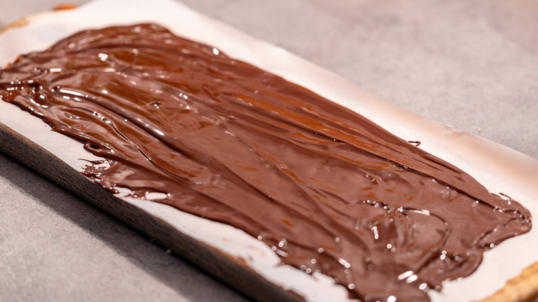 Then, once it's ready for action, be mindful of how you spread it. "You don't want it to be too thin," Goldman explains. "Because the thinner your chocolate is, when you spread it onto the acetate, the quicker it's going to set up, and there's a magic window of temperature."