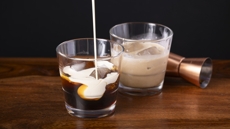 There are two types of milk punch — one is a frothy, creamy "un-clarified" milk punch, and the other is a "clarified" or "English" milk punch. For the purposes of this recipe, we're focused on the un-clarified version, which is more common in the South. Milk punch often calls for vanilla extract, but you obviously won't find any baking staples on your flights so you'll have to get creative with this flavoring aspect of the drink. We recommend asking for flavored half-and-half or oat milk as a substitute for vanilla extract. Otherwise, the drink is simple; just pour your bourbon, milk, half-and-half or cream, and bourbon over ice with some brown sugar if you can get it (regular will work as well), and you'll have yourself a flight-friendly milk punch cocktail.
