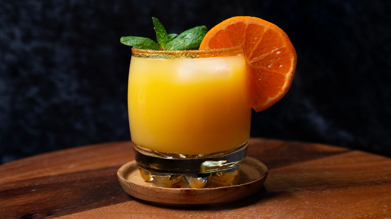 Although traditional whiskey sours are chilled with ice and strained over a glass, we recommend asking for ice for this one. The drink tastes best when it's chilled, so drinking (and making it) over ice is your best option. One thing to keep in mind is this a drink that can quickly tip into too sour territory, so if you're relying on the powdered citrus packets that are now commonplace in the skies, make sure to add it incrementally and give your drink a taste before you continue to dump in the dehydrated lemon. Another easy way to add a little citrus infusion to your whiskey sour is by adding a splash of orange juice, which should typically be available for free on your flight.
