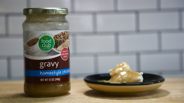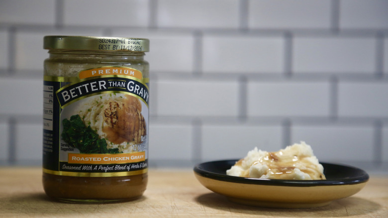 However, there isn't always time to roast meat and make gravy from scratch — luckily, though, store-bought gravies work as an alternative. Grocery stores are typically stocked with both powdered and liquid gravies, but the latter takes less work to prepare, as they can be quickly microwaved or heated in a saucepan. Although nothing beats homemade gravy, store-bought gravy still provides that savory, glossy sauce to elevate your dinner. I tested out nine liquid store-bought gravies to discern the best option by looking at texture, consistency, depth of flavor, color, salt level, and price point — something I'll go into in more detail on at the end of the article. Each brand of gravy was heated using the brand's listed microwave instructions to ensure consistency, and mashed potatoes were used as a vessel to test each one. Find out how they rank — as well as which two came in at a tie — so you're prepared ahead of your next grocery store run.