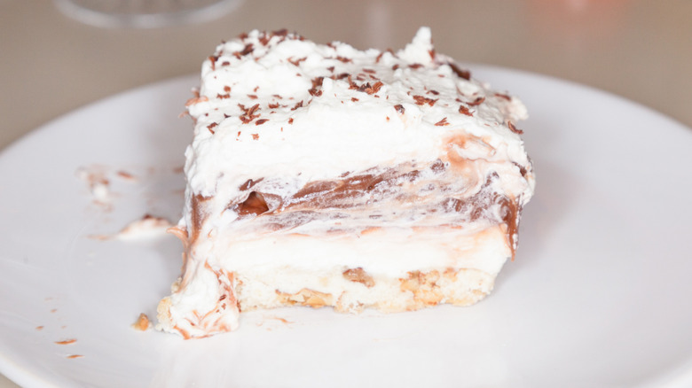 This dessert is as delicious as it is easy to put together. All you need to do is put the layers together in the right order, and voilà, it's ready to be enjoyed. While there are a few variations of this treat, all you need is cream cheese, chocolate pudding mix, whipped topping, and chopped pecans to make the basic recipe. This is one dessert that you can make at any time of year to impress your guests and offer those who grew up in the '70s a nostalgic treat.