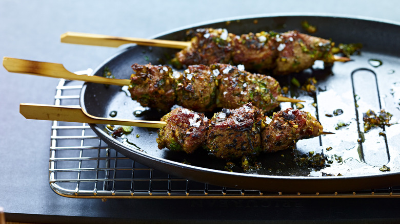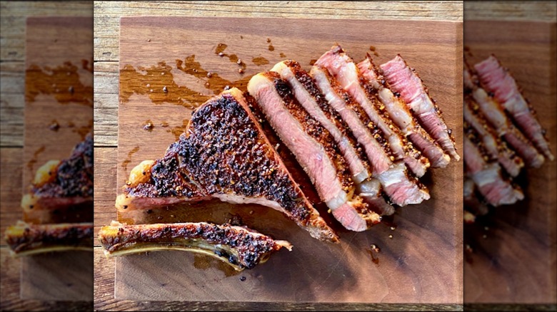 For your grilled steak that is just begging for a sprinkle of Maldon salt before serving, patience is the key. Remove the steak from the grill or pan, let it rest, and slice it however you like. It's at this point when you should grab that sprinkle of finishing salt and give each slice a small but meaningful portion. This is the method that chef Sue Zemanick recommends — slice and then season. That way, your smaller pieces are getting a more even, precise amount of salt.