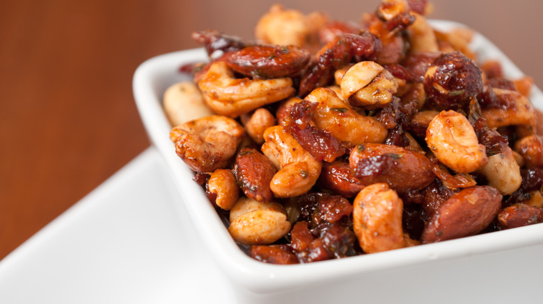 Packed with nutrients, fiber, and plant-based protein, nuts make a pretty unbeatable snack. Not only do they offer a satisfying texture and delicious earthy taste, but they also keep you feeling satisfied long after eating on account of their calorie density, making them ideal for a mid-afternoon pick-me-up when dinner seems just that little bit too far away. Though nuts, in their various types, boast naturally delicious, subtly sweet and toasty flavors, there's no denying that a delicious coating makes these nutritious little morsels that much more enjoyable. Sweet variations like cinnamon sugar pecans or caramelized almonds are great for satisfying a sweet tooth, but when that savory craving hits, Marmite offers itself as the prime choice as a coating for nuts for a delicious and nutritious snack.