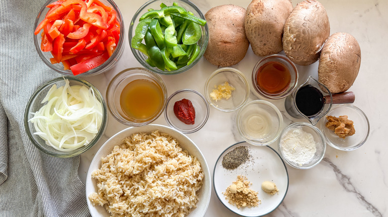 Gather the ingredients for vegan pepper portobello steak and rice recipe