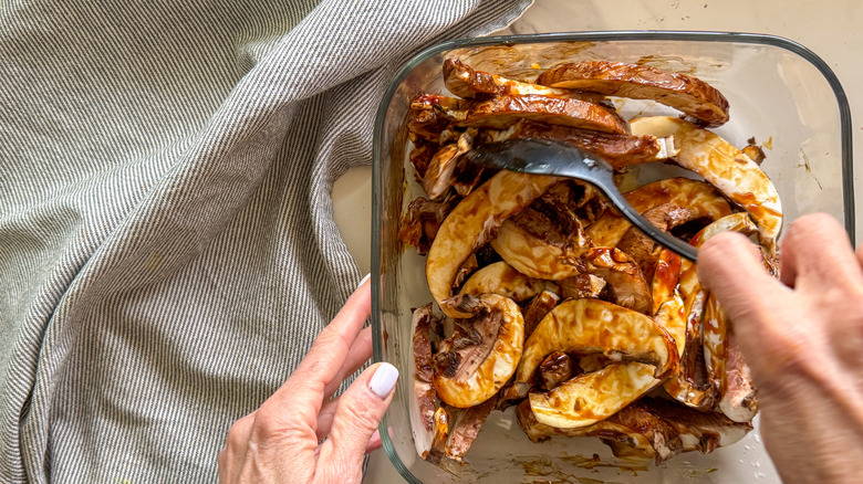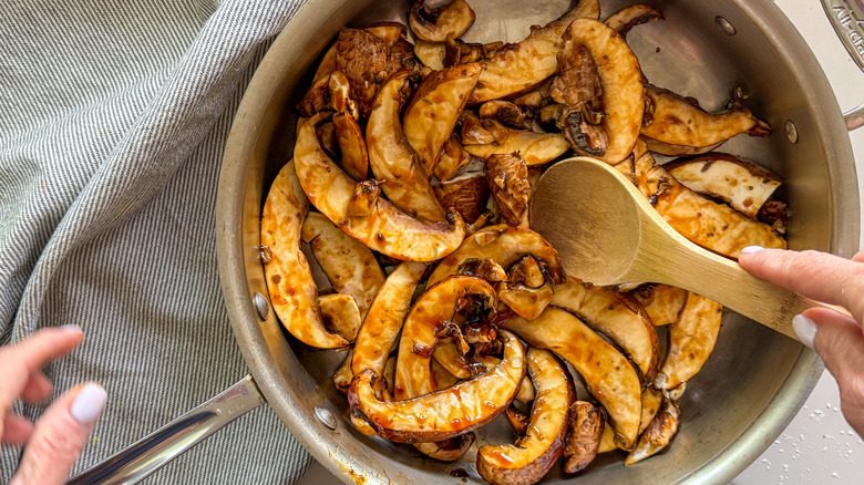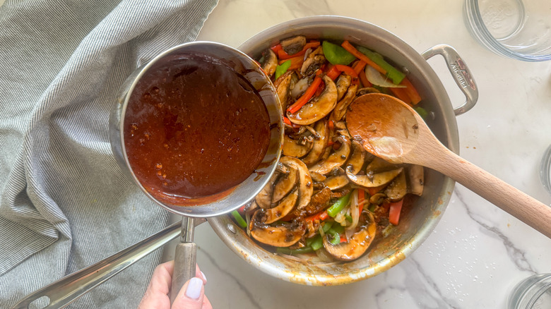 Pour the sauce over the mushrooms and stir to coat.