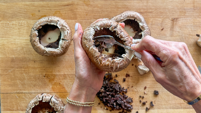 - Scrape the gill from the underside of each mushroom cap and discard.
