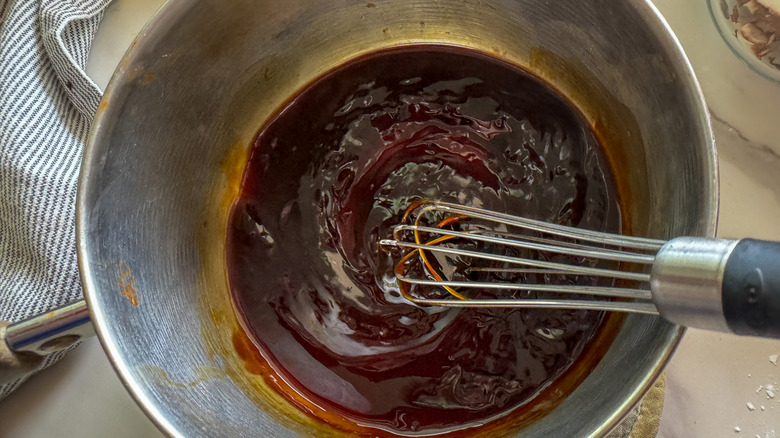 - Using the same small pot combine the remaining tamari, garlic, vegetable broth, maple syrup, miso paste, tomato paste, rice vinegar, ground ginger, dried mustard, and black pepper over medium low heat.