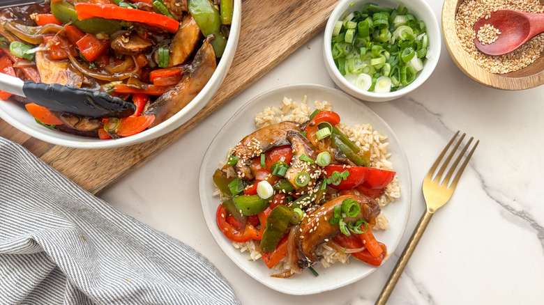 Whether or not you follow a vegan diet, this plant-based version of pepper steak will win you over with meaty portobello mushrooms cooked in a sticky-sweet tamari glaze with caramelized peppers and onions, all served over fluffy rice. It's a meal that checks all the boxes — bright, satisfying, packed with nutrients, and made in under 40 minutes. This meal stores exceptionally well in the fridge when saved in an airtight container. No need for takeout — this recipe is extremely versatile and if you make it at the beginning of the week you can serve it in different ways for lunches and dinners throughout the rest of the week.